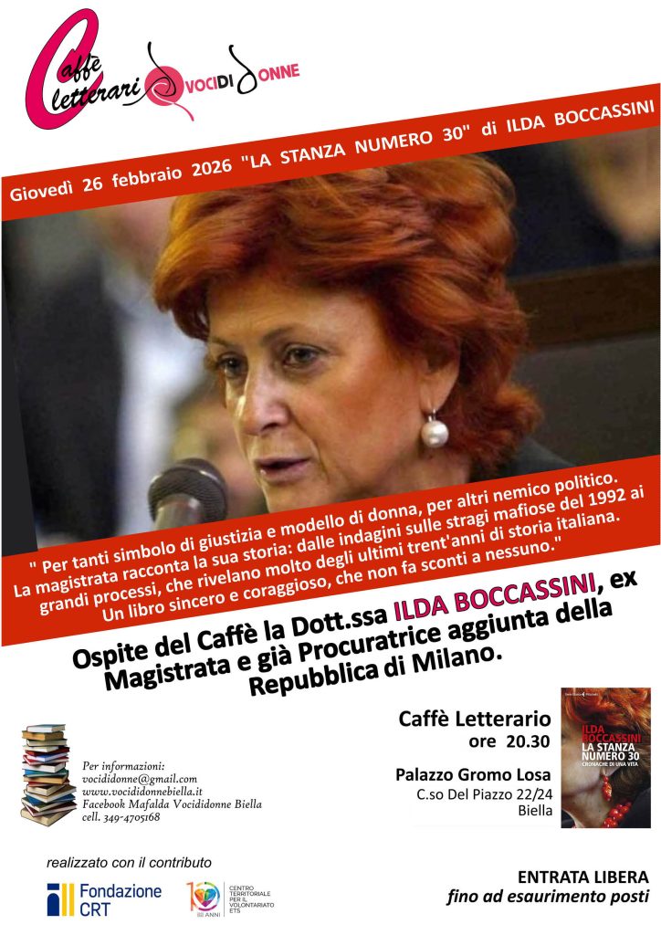 Calendario eventi GennaioFebbraio 2026Marzo LMMGVSD 2627282930311Eventi del 29 Gennaio Tutto il giornoElsa Fornero – Anna Lo Prete presentazione libro “Conoscere l’economia per scegliere meglio”Eventi del 1 Febbraio Tutto il giorno48a Giornata per la Vita2345678Eventi del 2 FebbraioNessun eventoEventi del 3 FebbraioNessun eventoEventi del 4 FebbraioNessun eventoEventi del 5 FebbraioNessun eventoEventi del 6 FebbraioNessun eventoEventi del 7 FebbraioNessun eventoEventi del 8 FebbraioNessun evento9101112131415Eventi del 9 FebbraioNessun eventoEventi del 10 Febbraio Tutto il giornoAperitivo con Azam BahramiEventi del 11 FebbraioNessun eventoEventi del 12 Febbraio Tutto il giornoJam Session rock blues r&bEventi del 13 FebbraioNessun eventoEventi del 14 FebbraioNessun eventoEventi del 15 FebbraioNessun evento16171819202122Eventi del 16 FebbraioNessun eventoEventi del 17 FebbraioNessun eventoEventi del 18 FebbraioNessun eventoEventi del 19 Febbraio Tutto il giornoIncontro per giovani Diabetici_Incontro al The Second Tutto il giornoDegustazione della “Pizza Biellese”Eventi del 20 FebbraioNessun eventoEventi del 21 FebbraioNessun eventoEventi del 22 FebbraioNessun evento2324252627281 Eventi del 23 FebbraioNessun eventoEventi del 24 FebbraioNessun eventoEventi del 25 FebbraioNessun eventoEventi del 26 Febbraio Tutto il giornoVoci di Donne – Incontro con Ilda BoccassiniEventi del 27 Febbraio Tutto il giornoLilt Vercelli_”LA PREVENZIONE” In parola e MusicaEventi del 28 Febbraio Tutto il giornoSilent Book Club – Biblioteca di Rovasenda Iscriviti alla newsletter La tua e-mail Nome Cognome ETS privacy Ho letto e approvo l'informativa sulla privacy* Invia Data 26 Feb 2026 Ora Tutto il giorno Etichette Biella Voci di Donne – Incontro con Ilda Boccassini Condividi questo evento + Aggiungi a Google Calendar + Esporta iCal