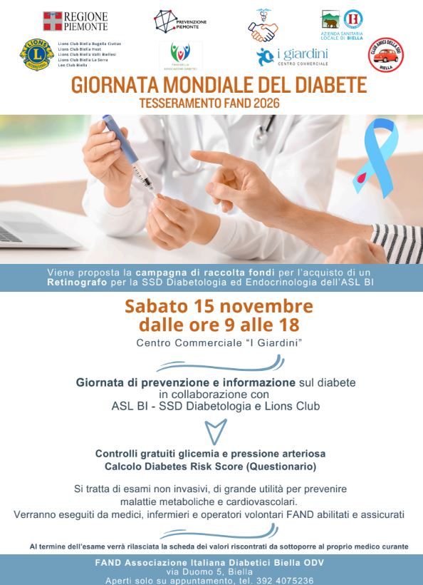 L’iniziativa è organizzata in collaborazione con l’ASL BI – SSD Diabetologia, i Distretti dei Lions Club della provincia di Biella, e l’Associazione FAND Diabetici Biella, con il sostegno della Regione Piemonte, del progetto Prevenzione Piemonte e dell’Associazione Club Amici della 500 di Biella.