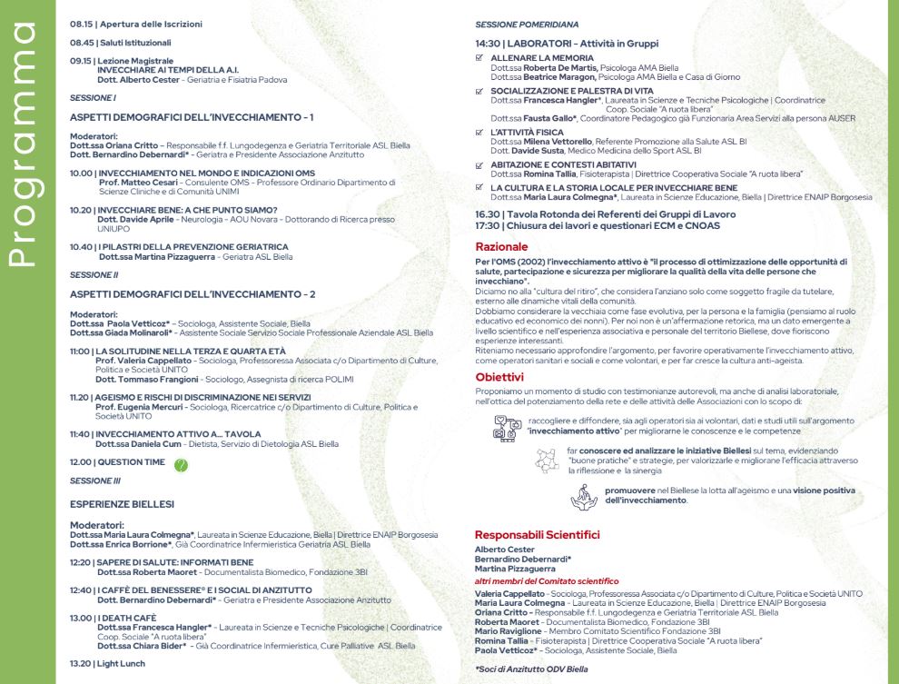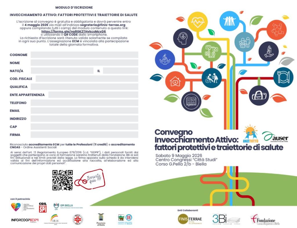 Biella - Il Convegno organizzato da Associazione Anzitutto e Auser Provinciale di Biella, è in programma sabato 9 maggio 2026, dalle 8 alle 17.30 presso il Centro Congressi di Città Studi. Iscrizioni entro il 4 maggio 2026.